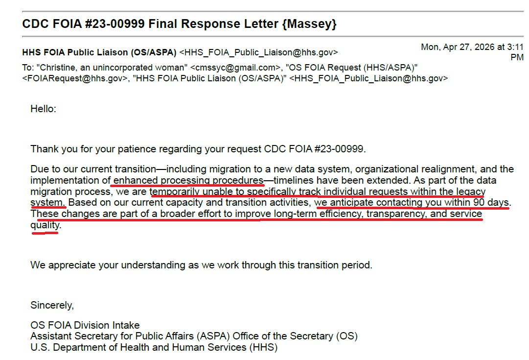 In the email shown further above, HHS’ AI made the dubious claim that “we anticipate contacting you within 90 days” and thanked me for my (imaginary) patience and understanding (pg 21-22).
